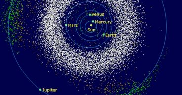 Trojans: These asteroids share an orbit with a larger planet, but do not collide with it because they gather around two special places in the orbit. There, the gravitational pull from the sun and the planet are balanced by a trojan's tendency to otherwise fly out of the orbit. The Jupiter trojans form the most significant population of trojan asteroids. It is thought that they are as numerous as the asteroids in the asteroid belt.